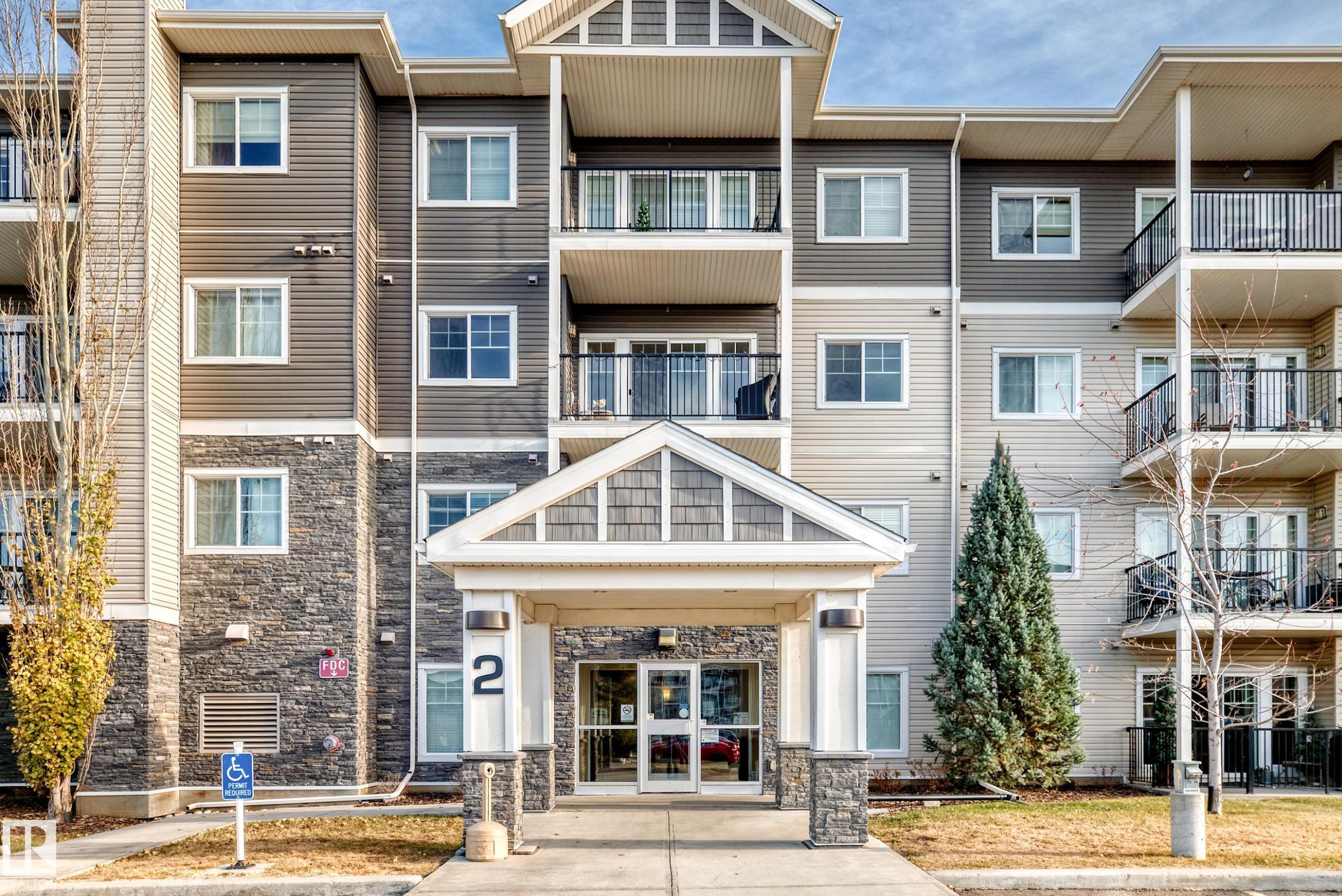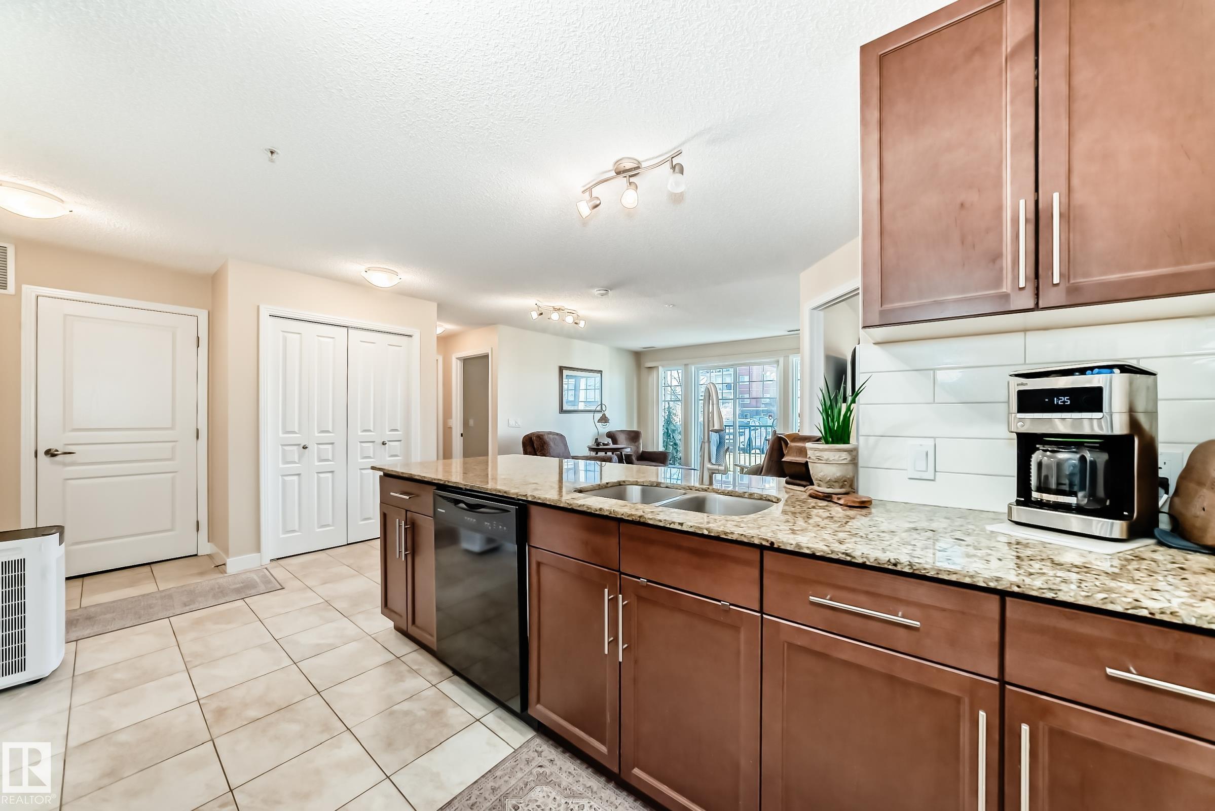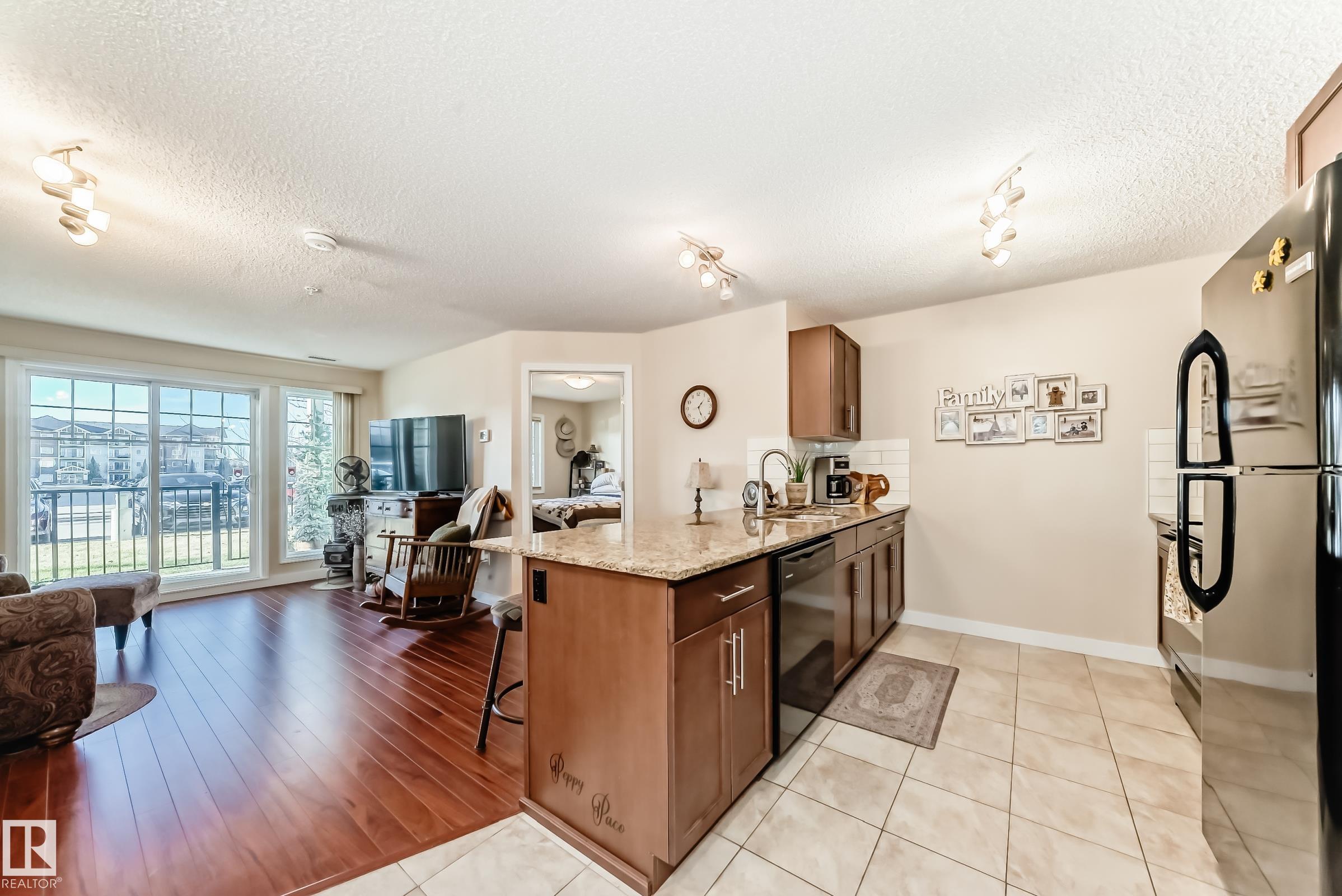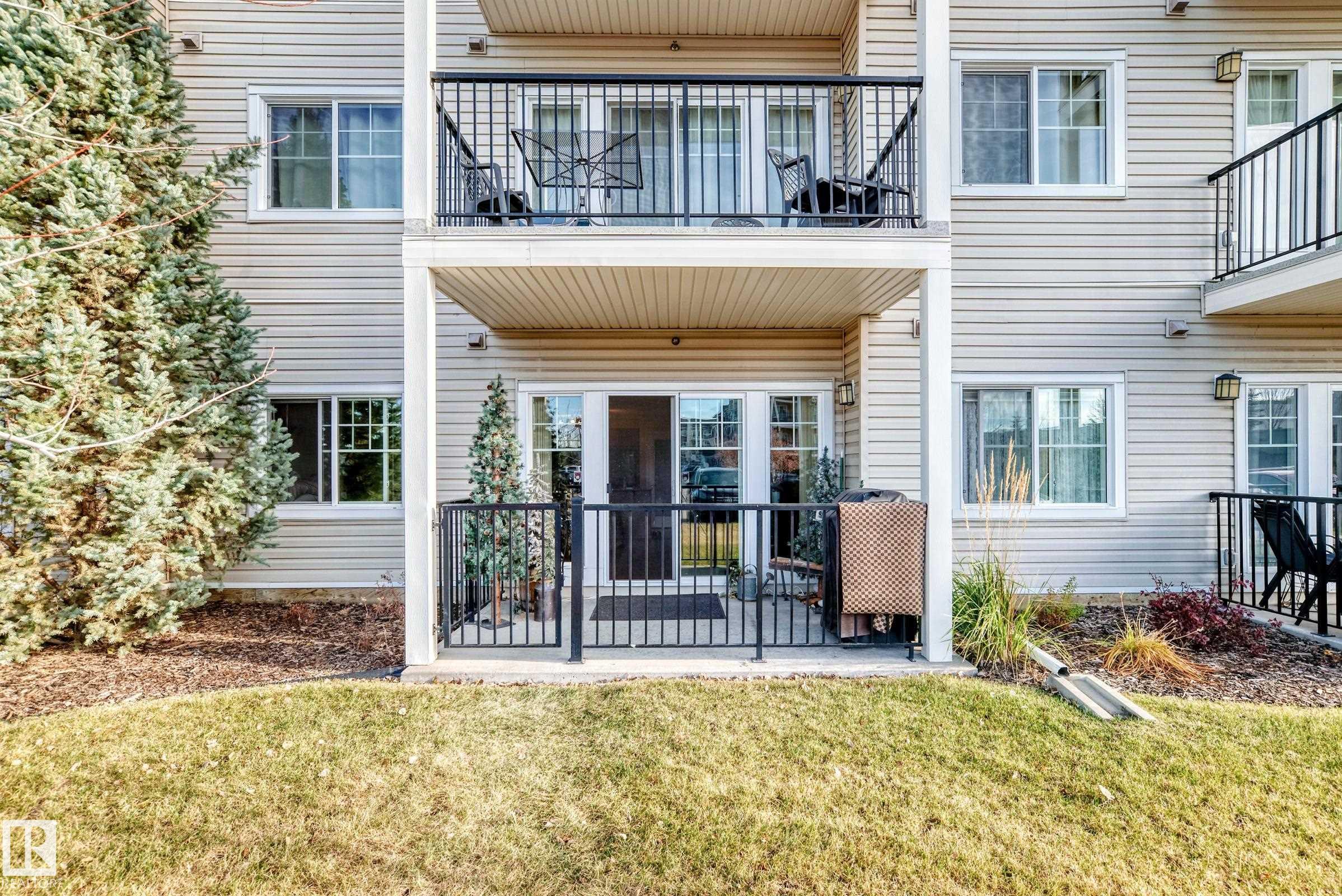 Welcome to Aspen Park Condos! Step inside to this very well maintained 2 bedroom, 2 bath situated on the main floor near the front entrance. The unit offers a functional living space, two good size bedrooms with the primary having a walk-through closet and walk-in shower. The kitchen is finished with granite countertops, tons of cabinet space, ceramic tile flooring and breakfast bar. The laundry room has plenty of space for storage with the unit having A/C roughed in. The west facing patio conveniently has a gate on the railing steps from your titled parking stall. The building also has communal planter boxes and a small fitness area. This location has plenty of shopping, transportation, restaurants, medical services and endless walking paths surrounded by ponds and greenery. Condo fees include heat and water.