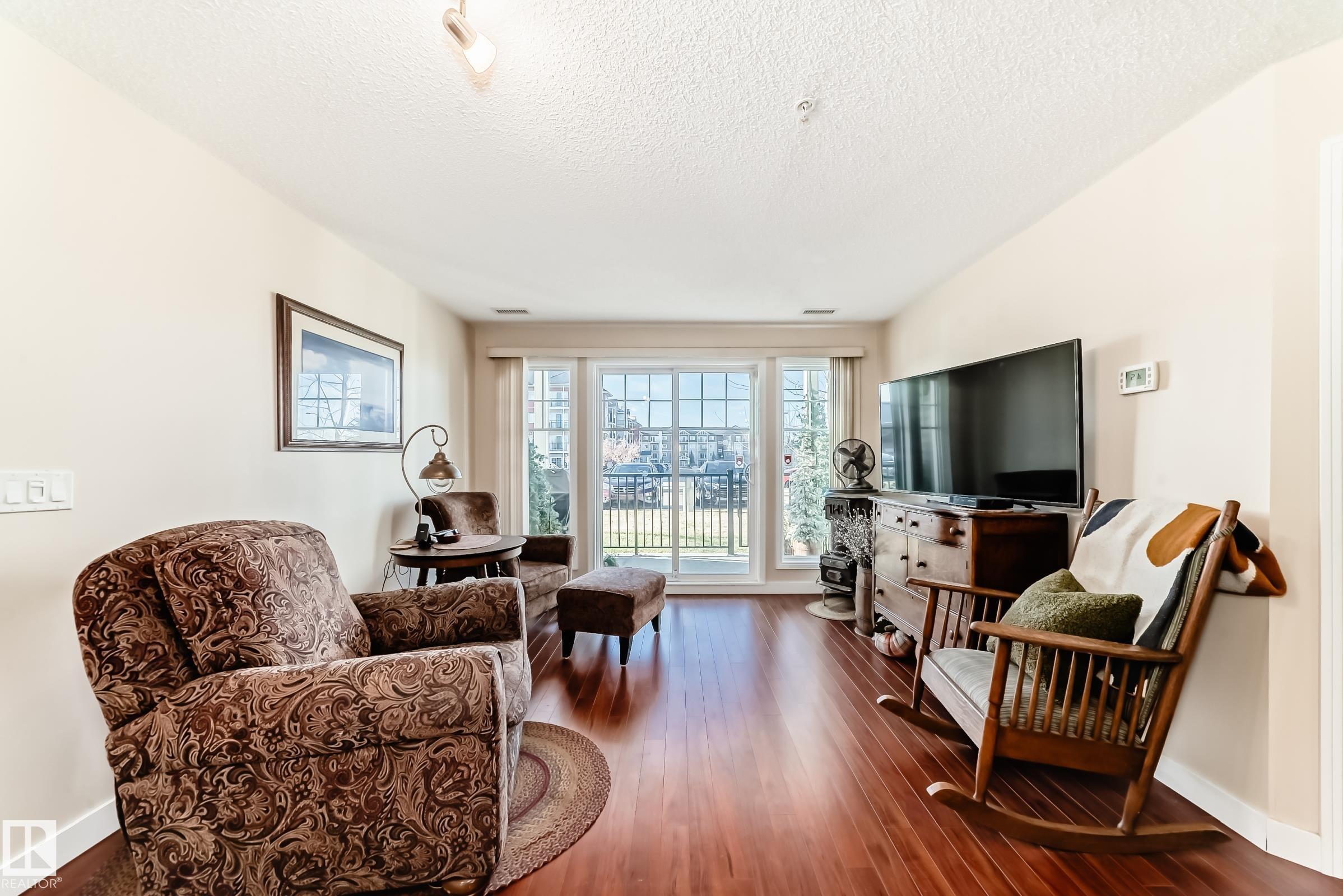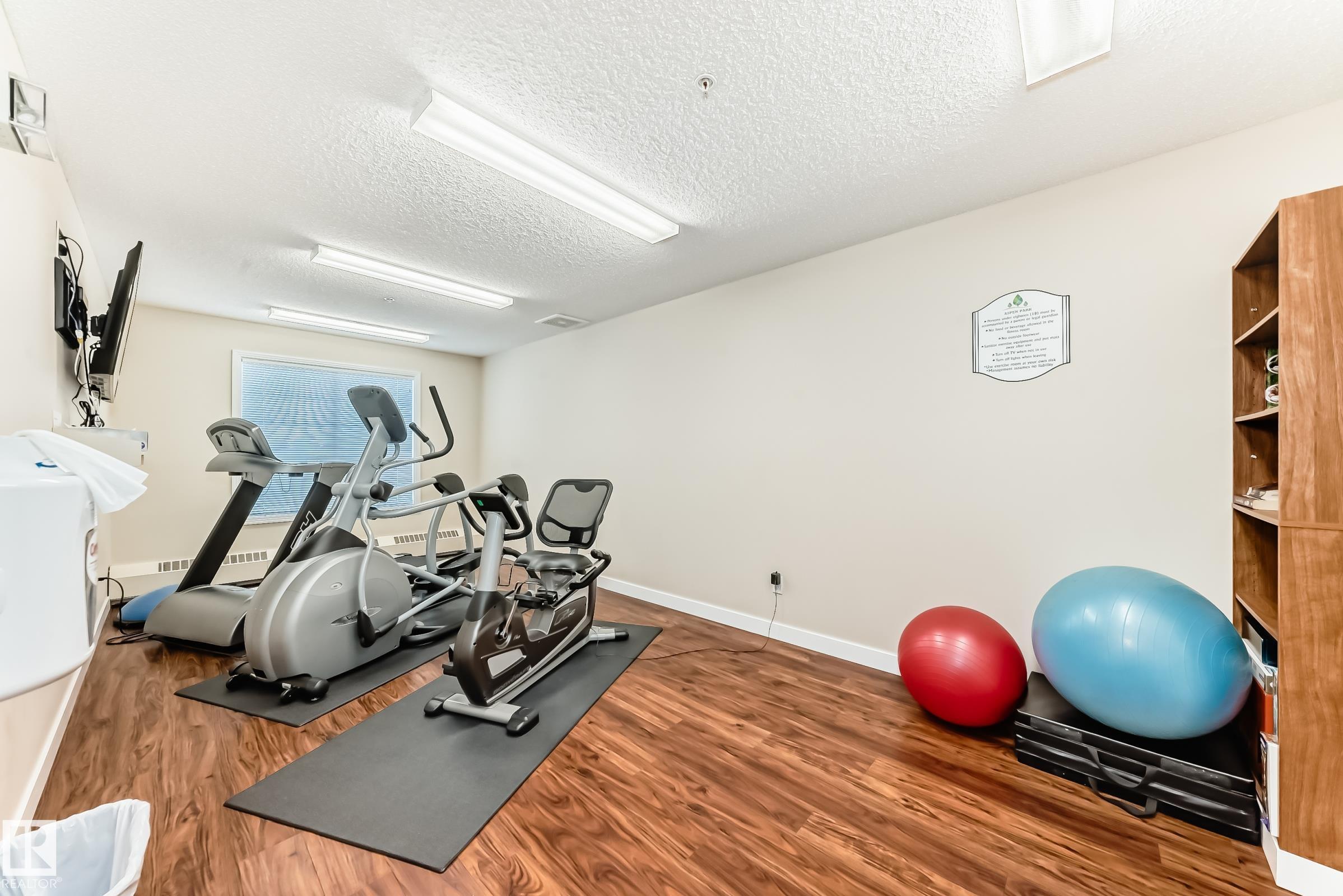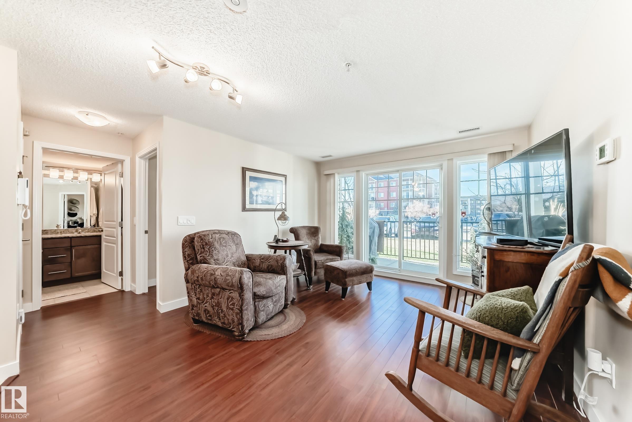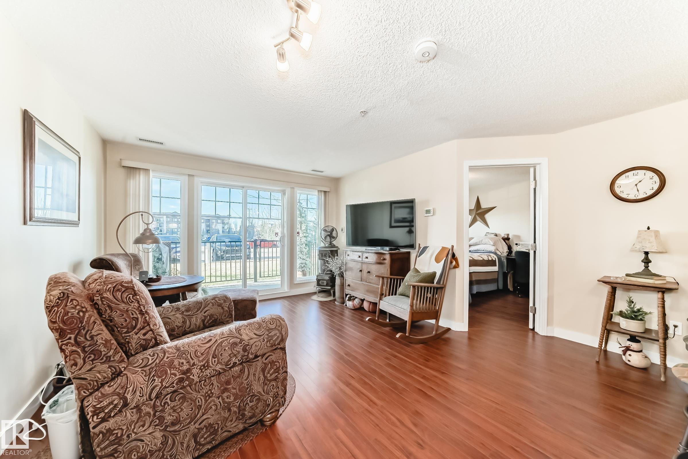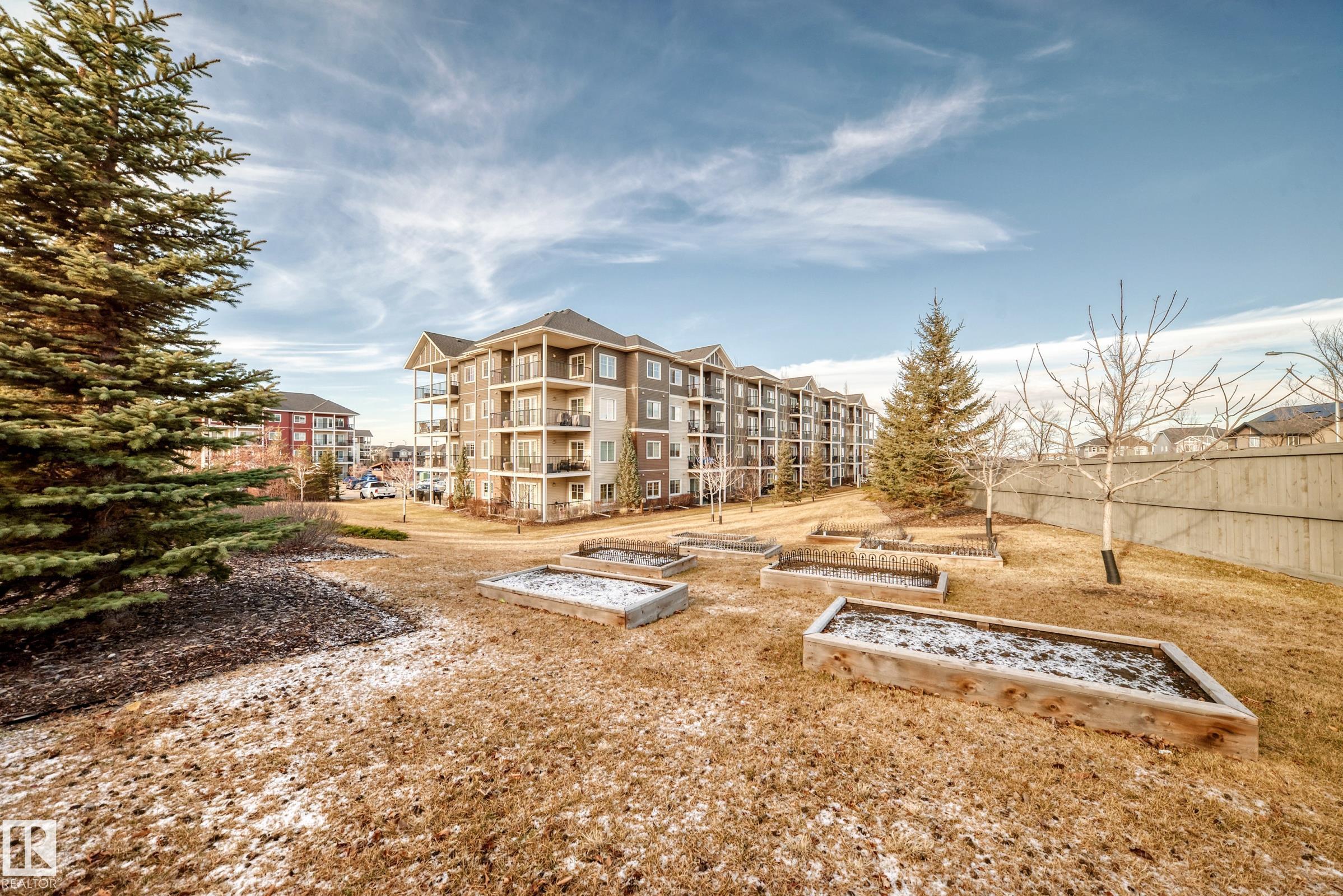 Welcome to Aspen Park Condos! Step inside to this very well maintained 2 bedroom, 2 bath situated on the main floor near the front entrance. The unit offers a functional living space, two good size bedrooms with the primary having a walk-through closet and walk-in shower. The kitchen is finished with granite countertops, tons of cabinet space, ceramic tile flooring and breakfast bar. The laundry room has plenty of space for storage with the unit having A/C roughed in. The west facing patio conveniently has a gate on the railing steps from your titled parking stall. The building also has communal planter boxes and a small fitness area. This location has plenty of shopping, transportation, restaurants, medical services and endless walking paths surrounded by ponds and greenery. Condo fees include heat and water.