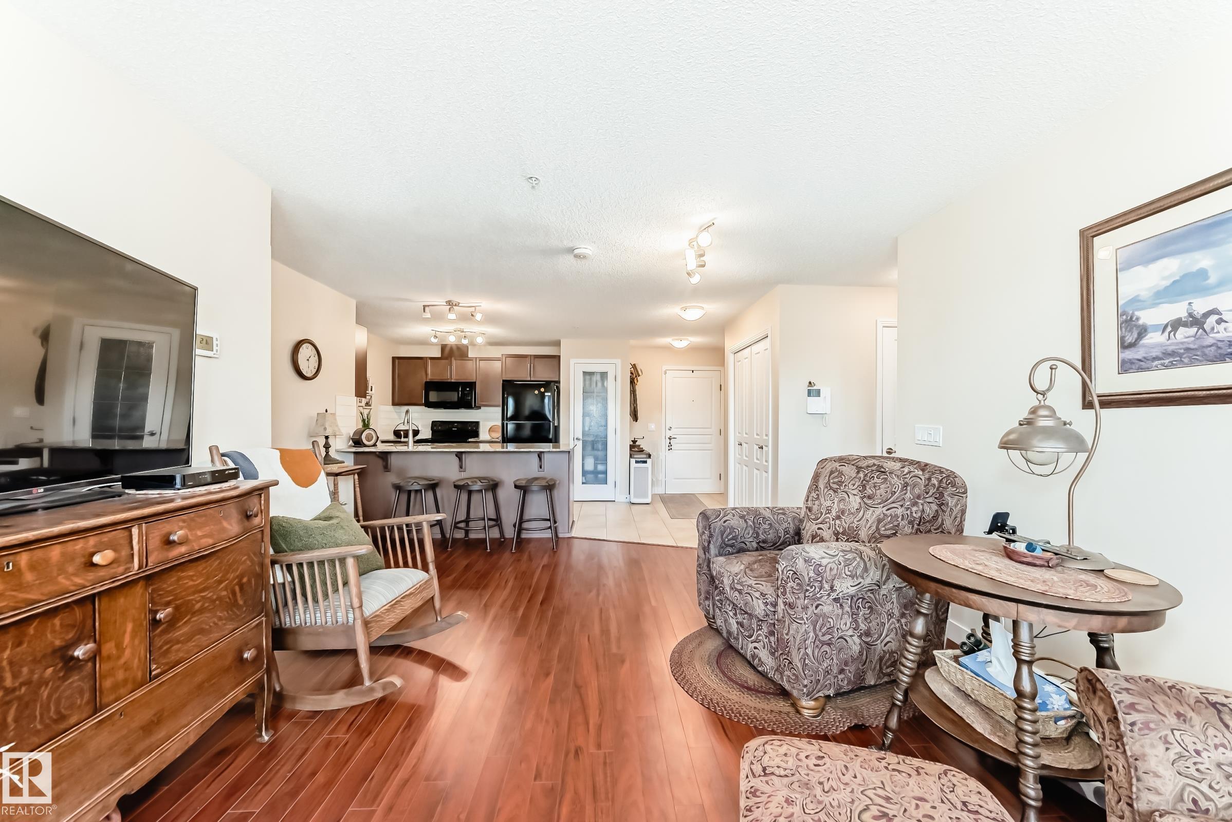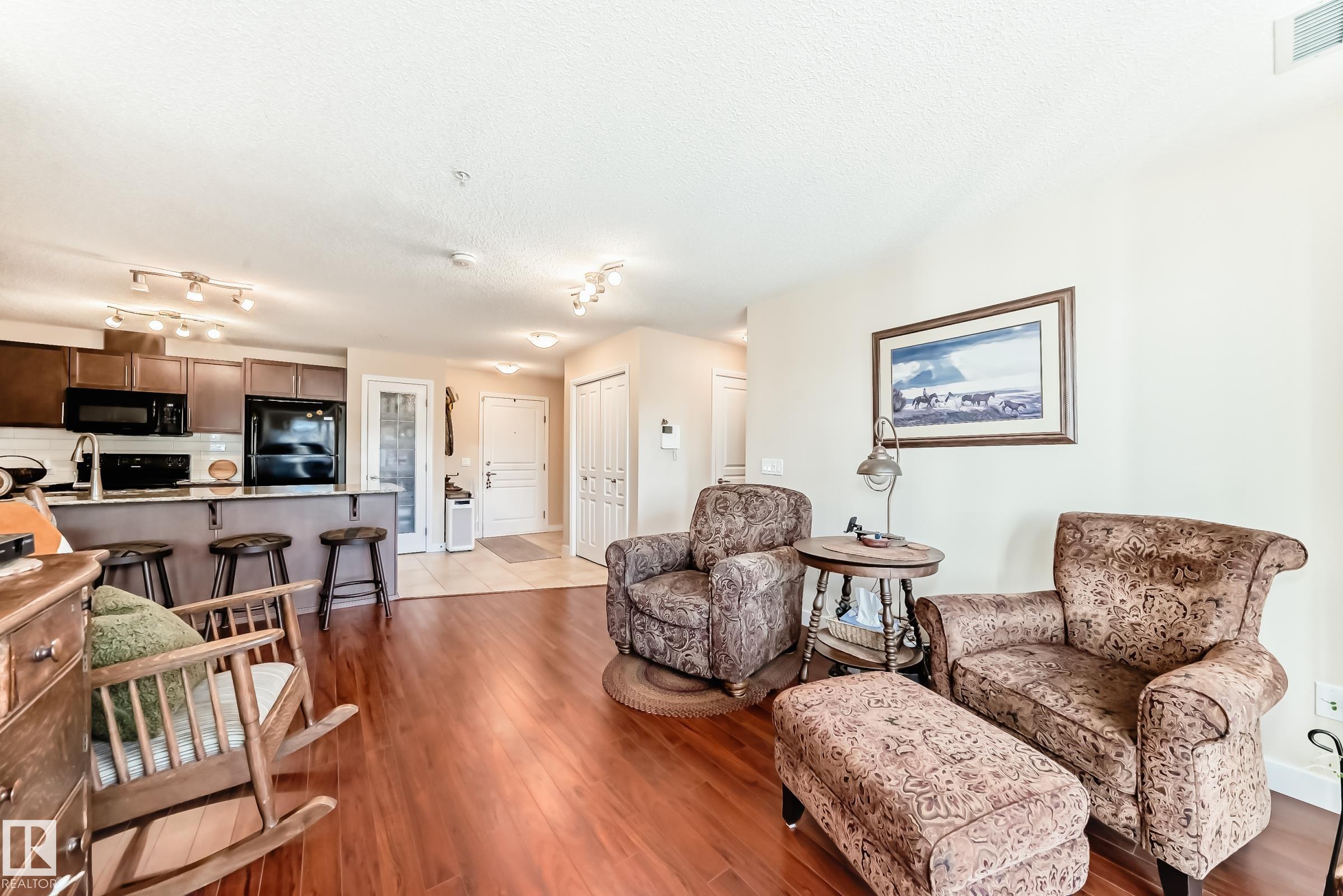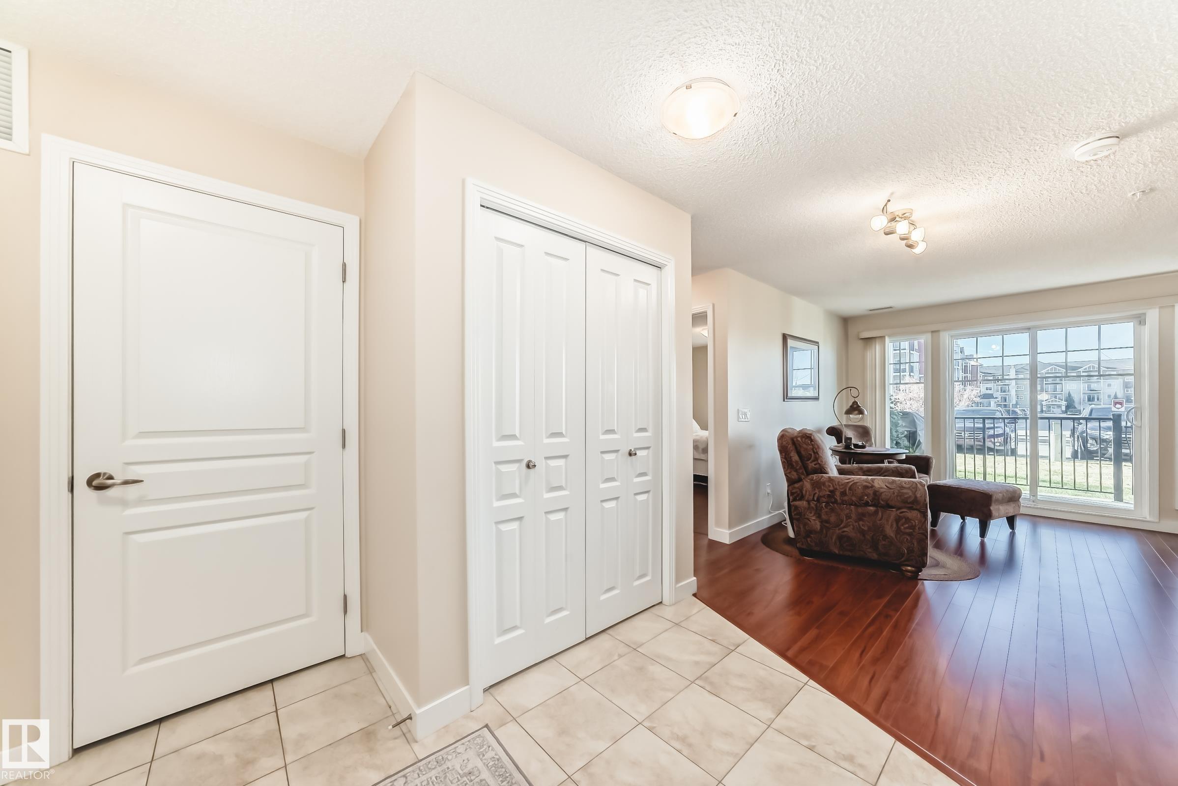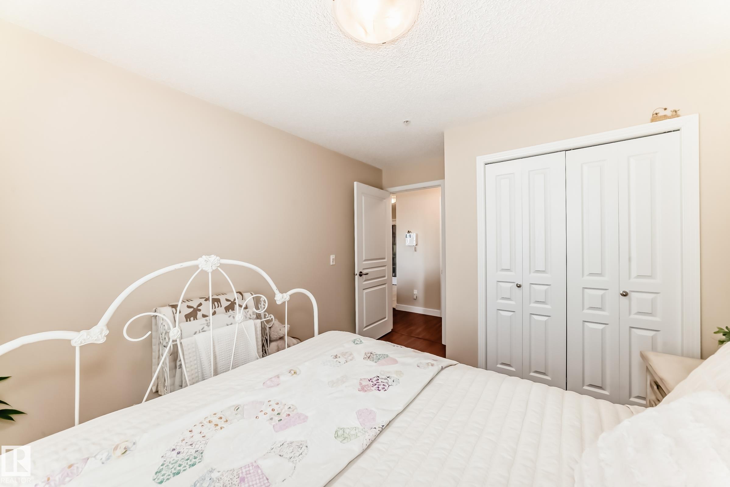 Welcome to Aspen Park Condos! Step inside to this very well maintained 2 bedroom, 2 bath situated on the main floor near the front entrance. The unit offers a functional living space, two good size bedrooms with the primary having a walk-through closet and walk-in shower. The kitchen is finished with granite countertops, tons of cabinet space, ceramic tile flooring and breakfast bar. The laundry room has plenty of space for storage with the unit having A/C roughed in. The west facing patio conveniently has a gate on the railing steps from your titled parking stall. The building also has communal planter boxes and a small fitness area. This location has plenty of shopping, transportation, restaurants, medical services and endless walking paths surrounded by ponds and greenery. Condo fees include heat and water.