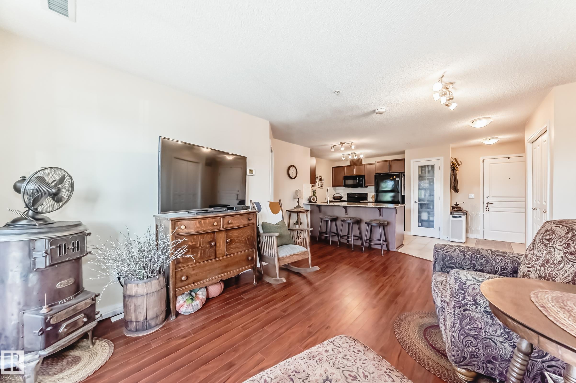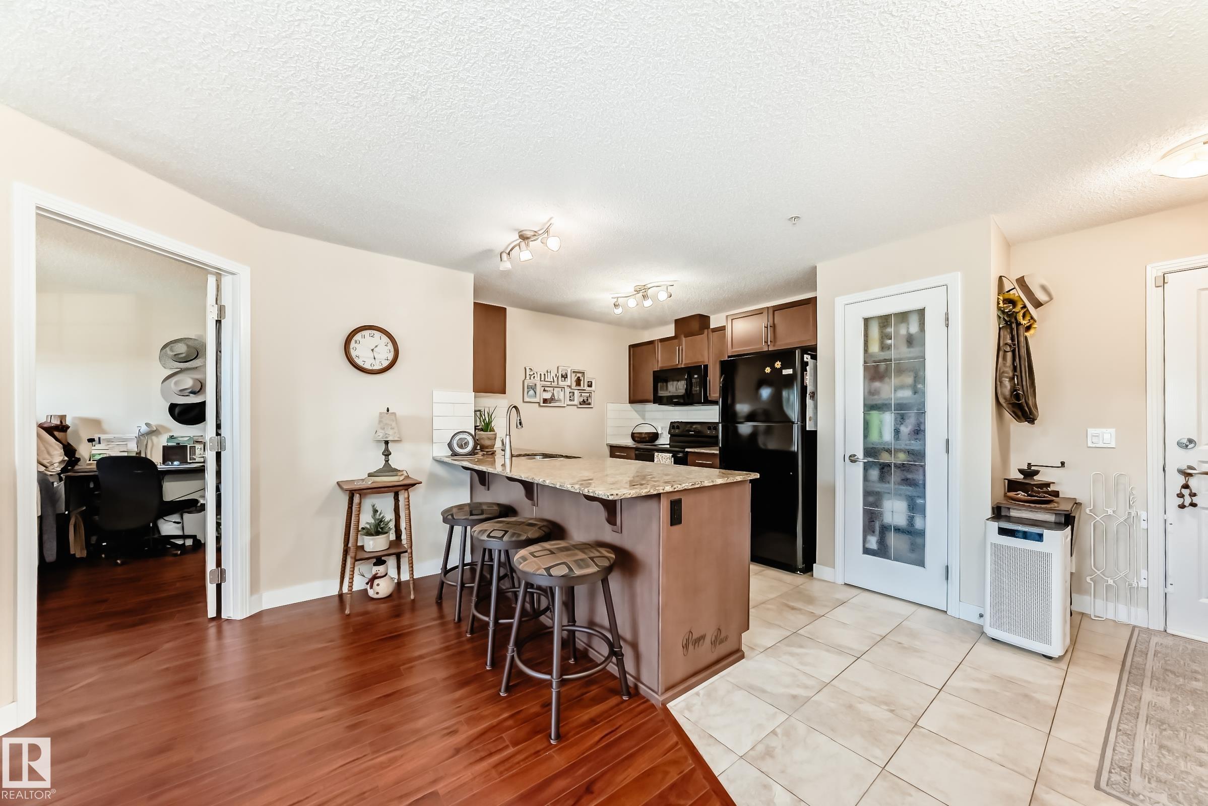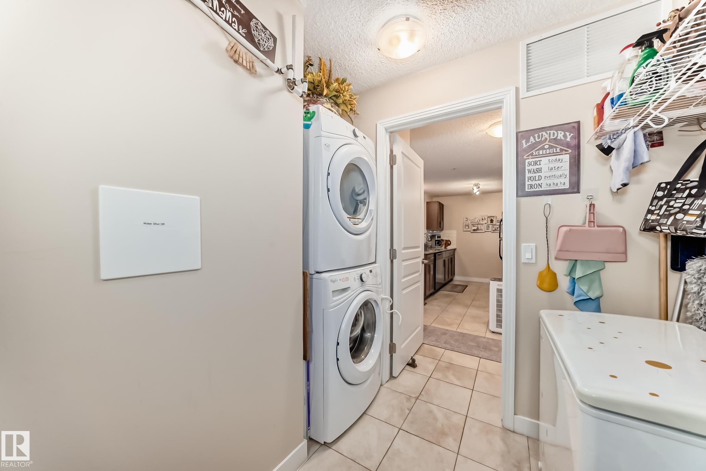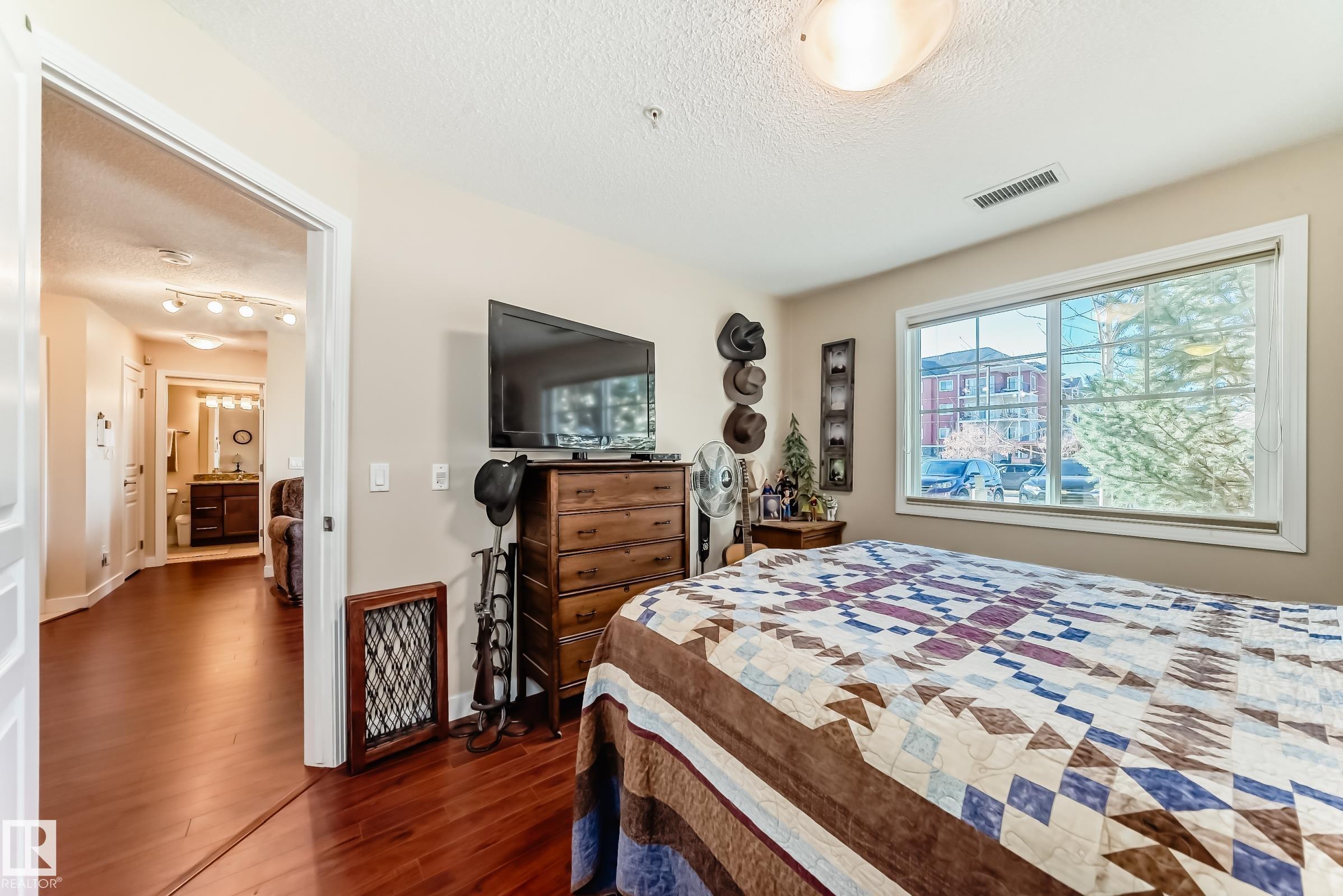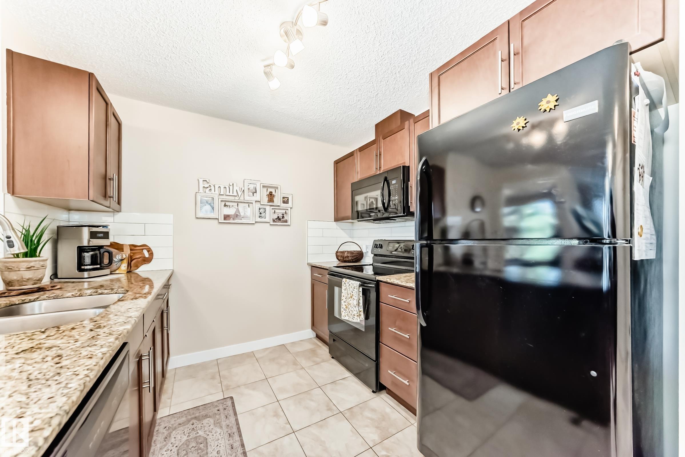 Welcome to Aspen Park Condos! Step inside to this very well maintained 2 bedroom, 2 bath situated on the main floor near the front entrance. The unit offers a functional living space, two good size bedrooms with the primary having a walk-through closet and walk-in shower. The kitchen is finished with granite countertops, tons of cabinet space, ceramic tile flooring and breakfast bar. The laundry room has plenty of space for storage with the unit having A/C roughed in. The west facing patio conveniently has a gate on the railing steps from your titled parking stall. The building also has communal planter boxes and a small fitness area. This location has plenty of shopping, transportation, restaurants, medical services and endless walking paths surrounded by ponds and greenery. Condo fees include heat and water.