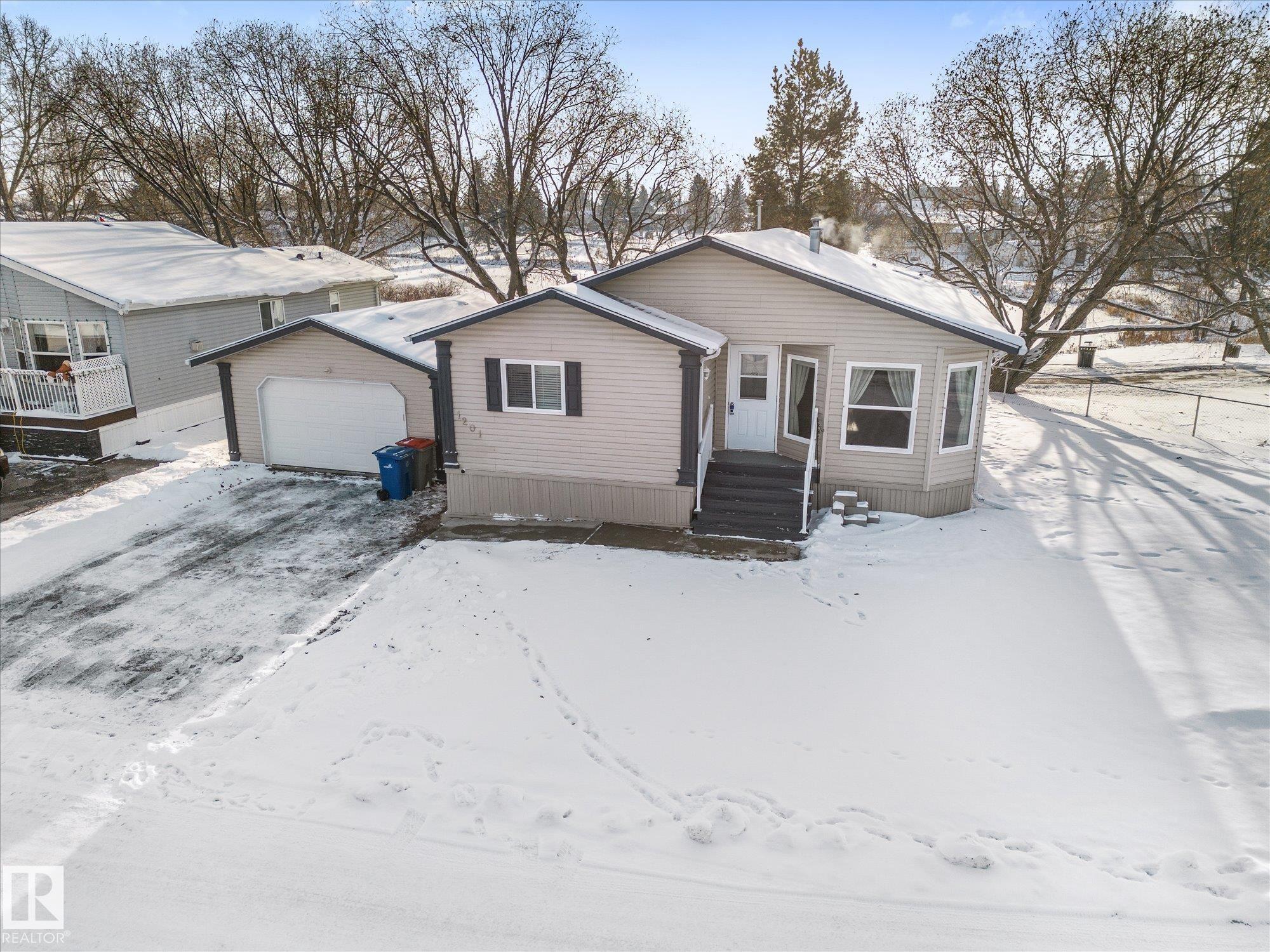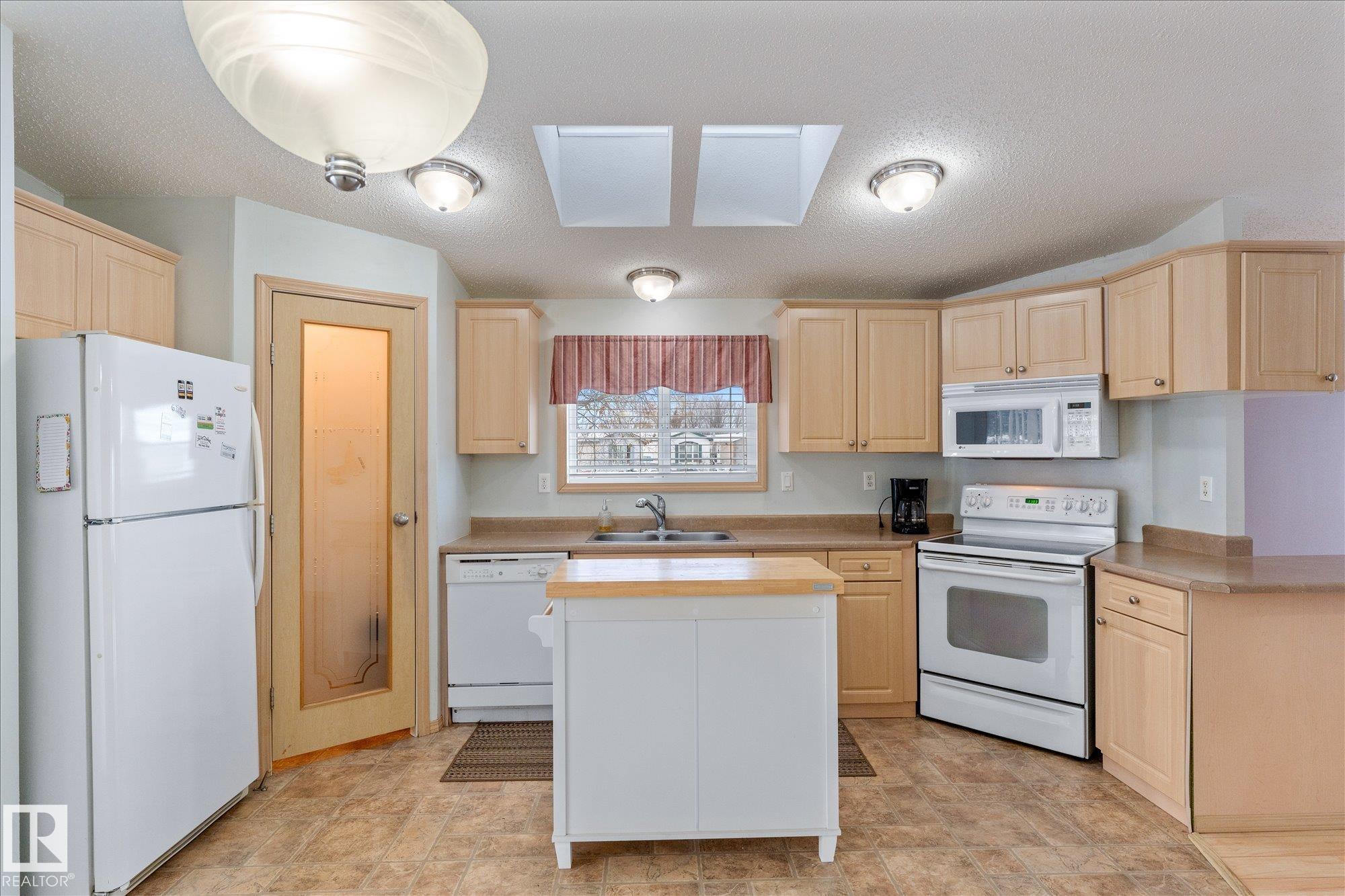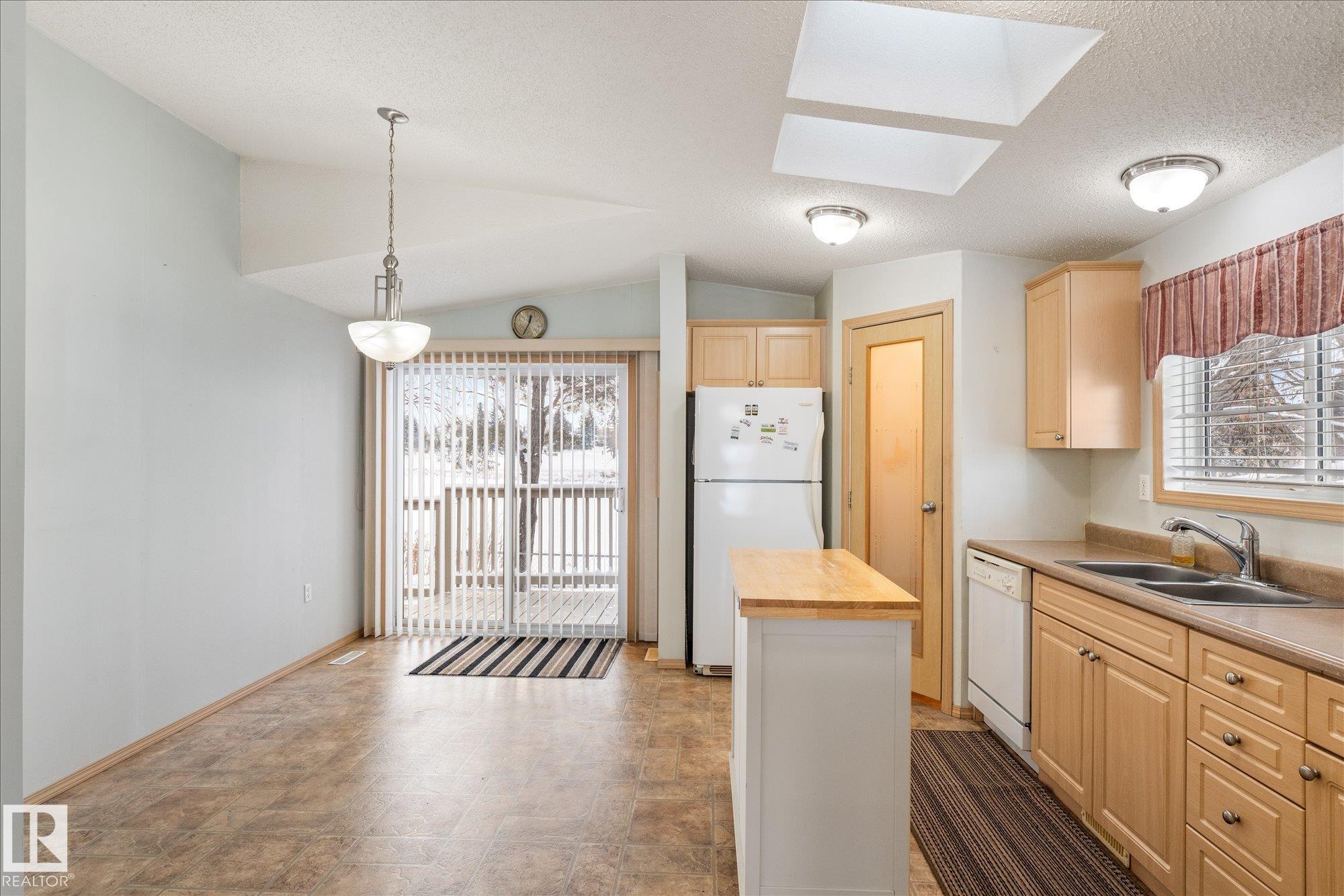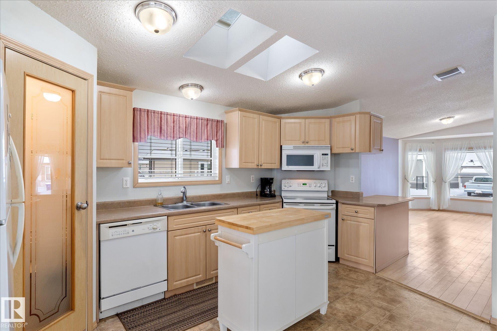 Discover one of the rarest and most desirable lots in Parkland Village with this double wide home set on an exceptional oversized yard backing directly onto the community pond. Properties with this kind of outdoor space, privacy, and natural scenery are few and far between. Enjoy the expansive 10' x 22' back deck overlooking peaceful water views, mature trees, and nearby walking paths. Inside, the 2005 double wide offers a bright, open layout featuring vaulted ceilings, skylights, a spacious kitchen and dining area with ample maple cabinetry and a convenient pantry. The living room?s large windows highlight the scenic setting and provide an inviting backdrop for everyday living. The primary bedroom includes a walk in closet and a private ensuite with an oval jetted tub. Outside, the standout feature is the incredible yard, oversized, partially fenced, and perfectly positioned along the pond. A paved driveway leads to a 24' x 22' detached garage that is insulated and finished inside. All appliances and w