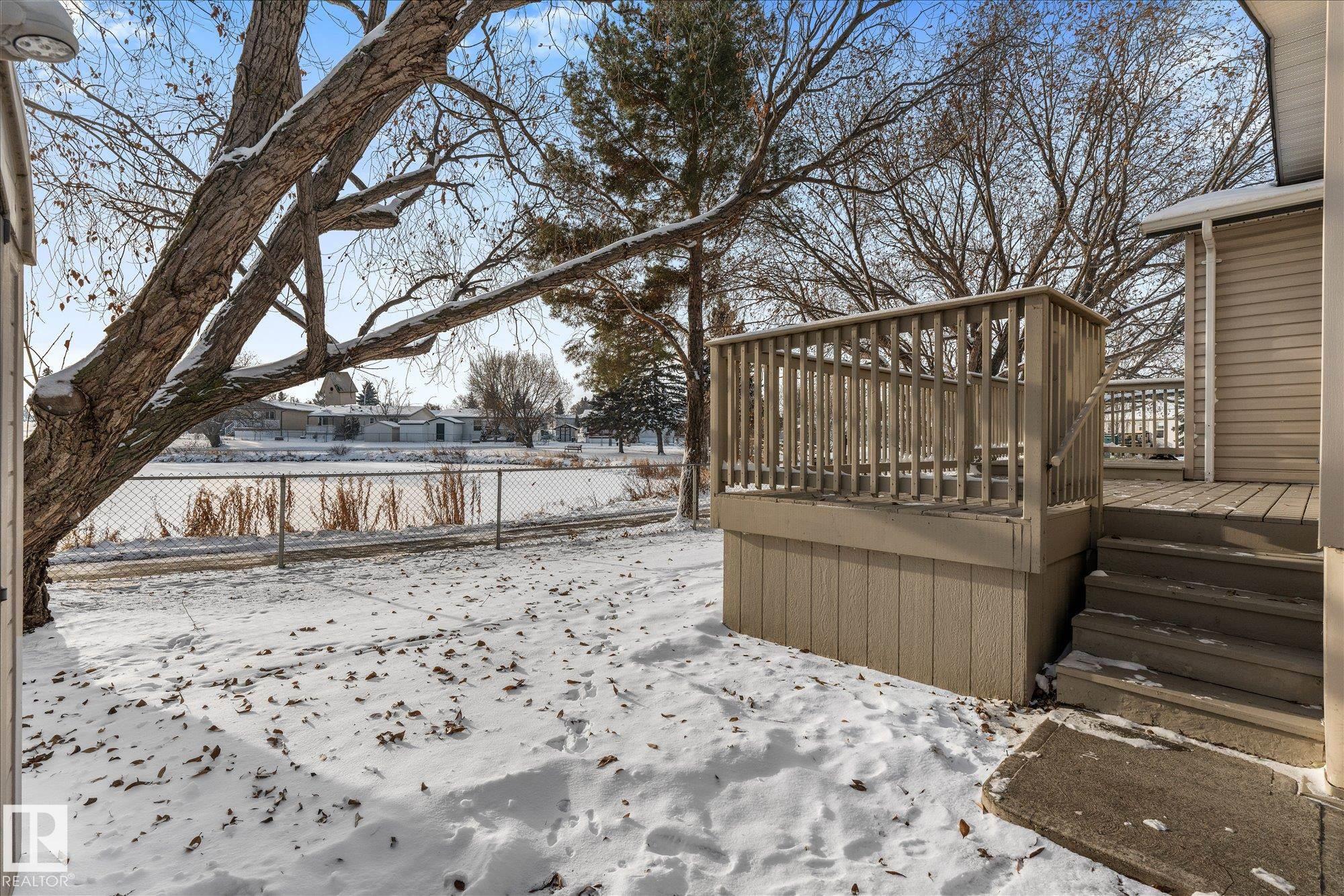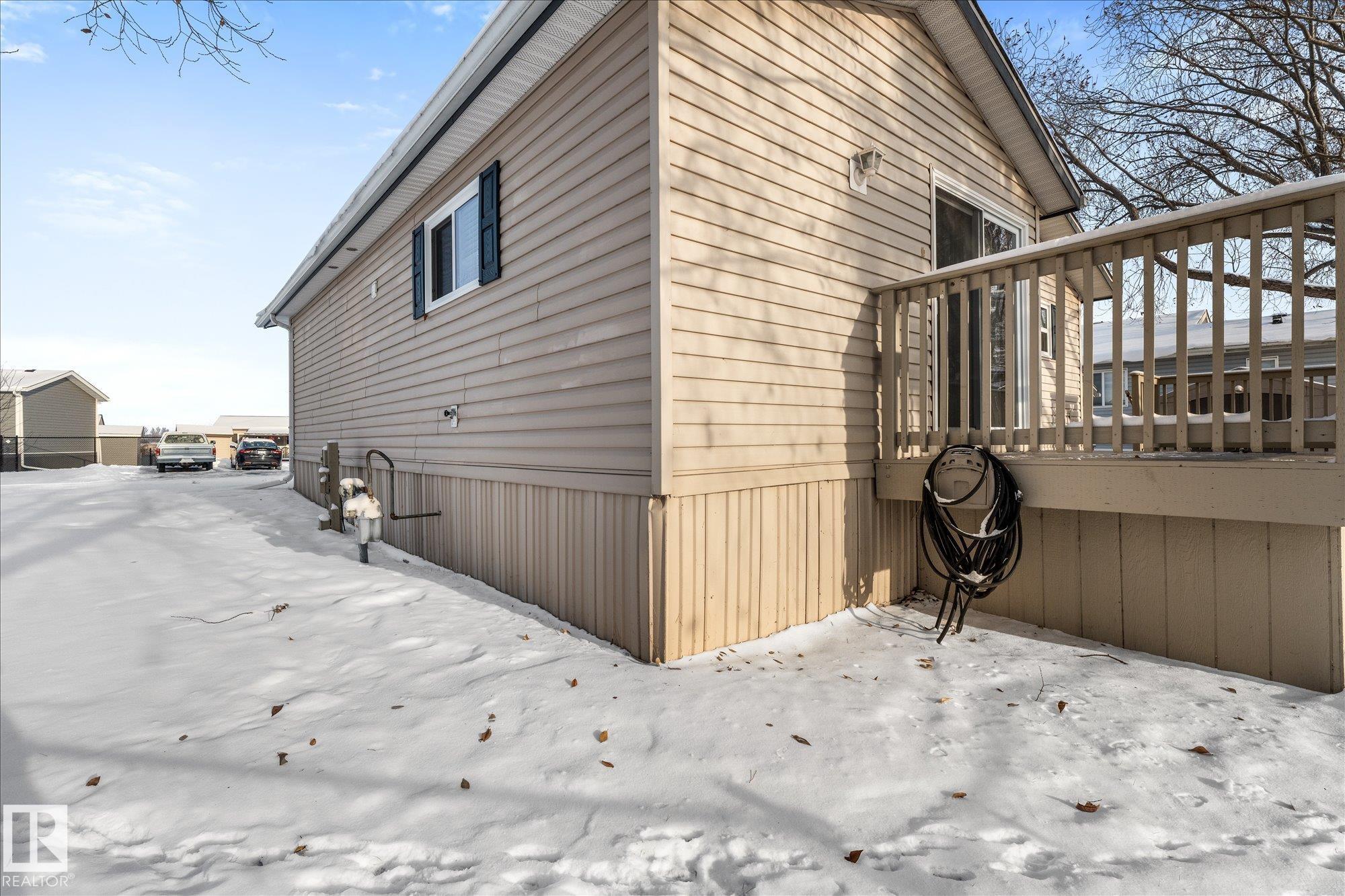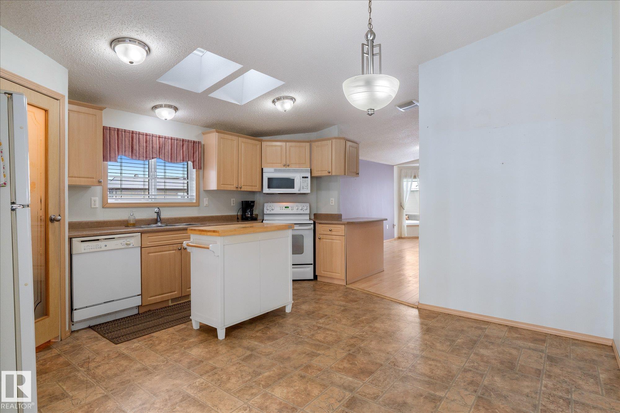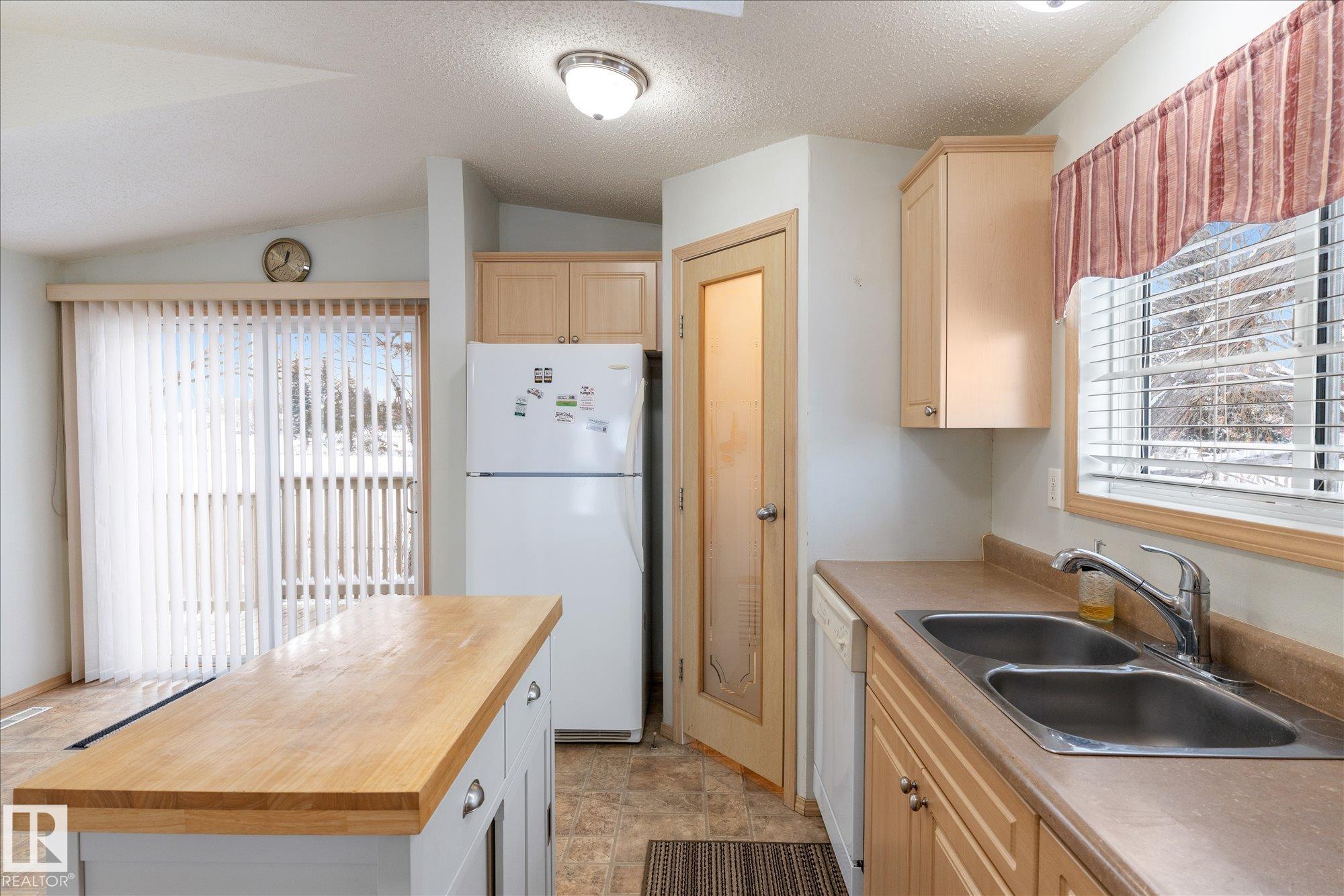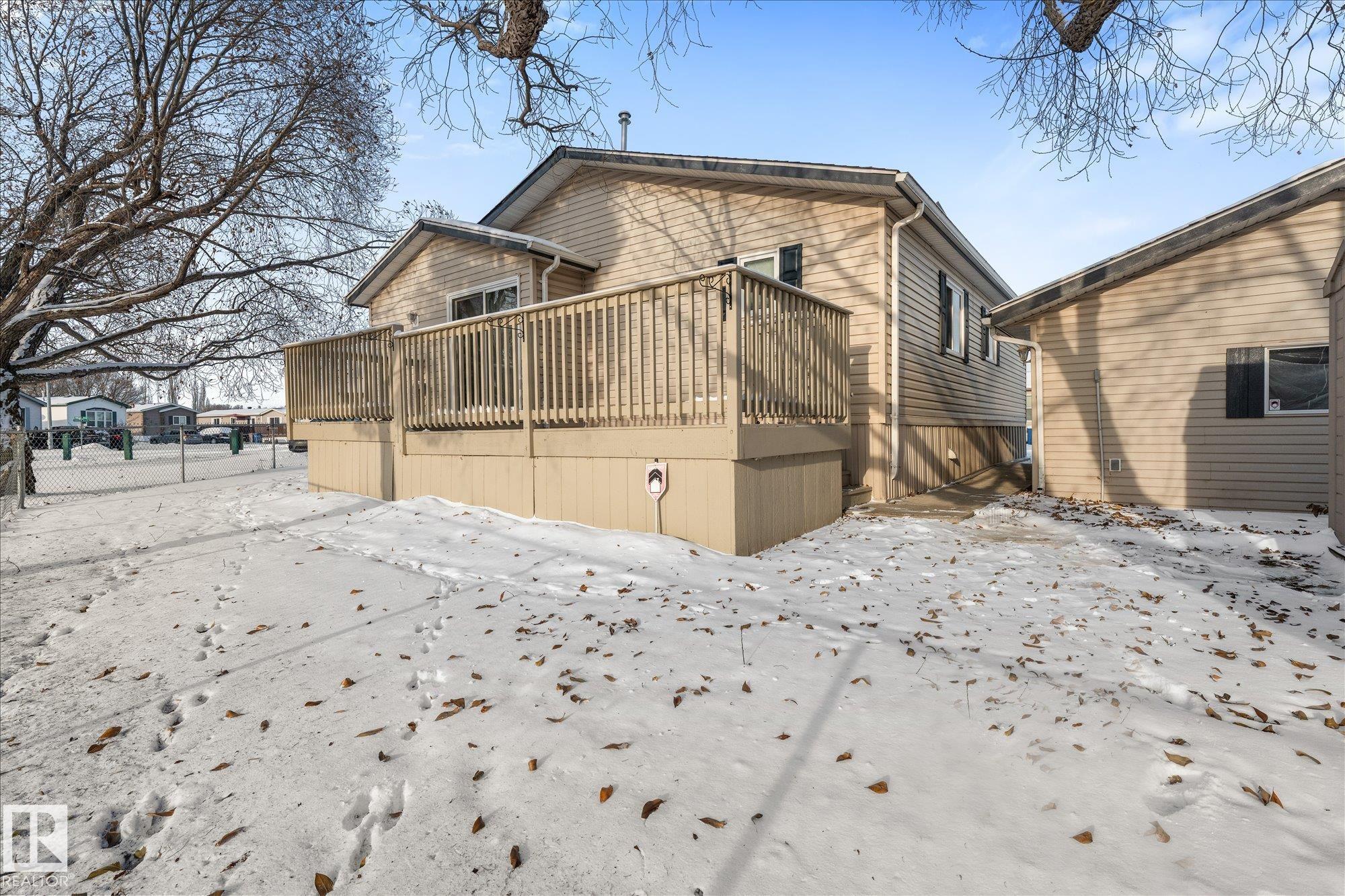 Discover one of the rarest and most desirable lots in Parkland Village with this double wide home set on an exceptional oversized yard backing directly onto the community pond. Properties with this kind of outdoor space, privacy, and natural scenery are few and far between. Enjoy the expansive 10' x 22' back deck overlooking peaceful water views, mature trees, and nearby walking paths. Inside, the 2005 double wide offers a bright, open layout featuring vaulted ceilings, skylights, a spacious kitchen and dining area with ample maple cabinetry and a convenient pantry. The living room?s large windows highlight the scenic setting and provide an inviting backdrop for everyday living. The primary bedroom includes a walk in closet and a private ensuite with an oval jetted tub. Outside, the standout feature is the incredible yard, oversized, partially fenced, and perfectly positioned along the pond. A paved driveway leads to a 24' x 22' detached garage that is insulated and finished inside. All appliances and w